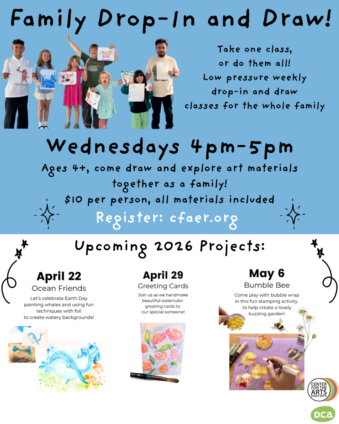 Doodle Hour is now Family Drop-In and Draw! Spend an hour after school learning drawing techniques and exploring art materials. Take one class, or join them all! Low pressure weekly drop-in and draw class for the whole family.